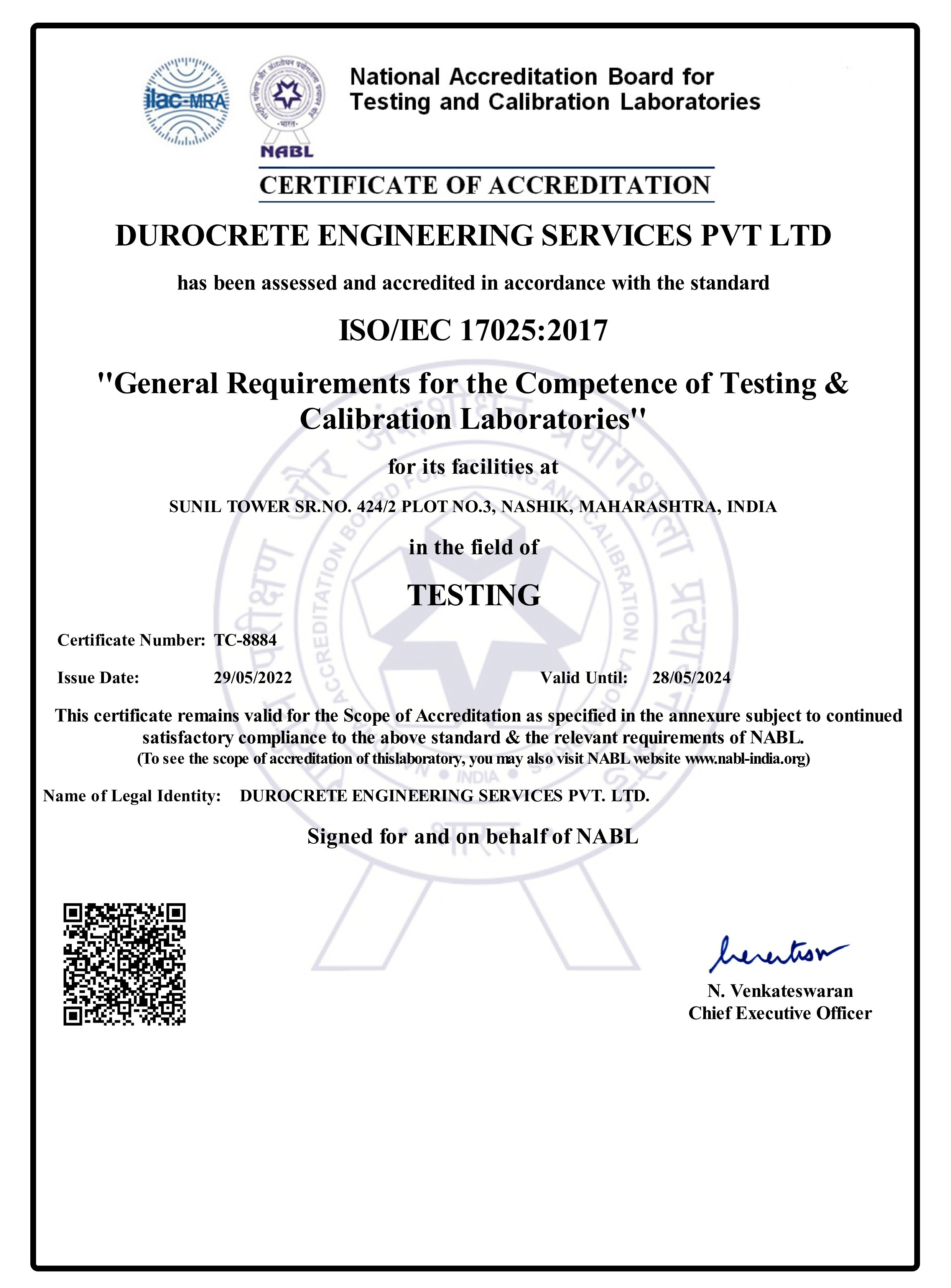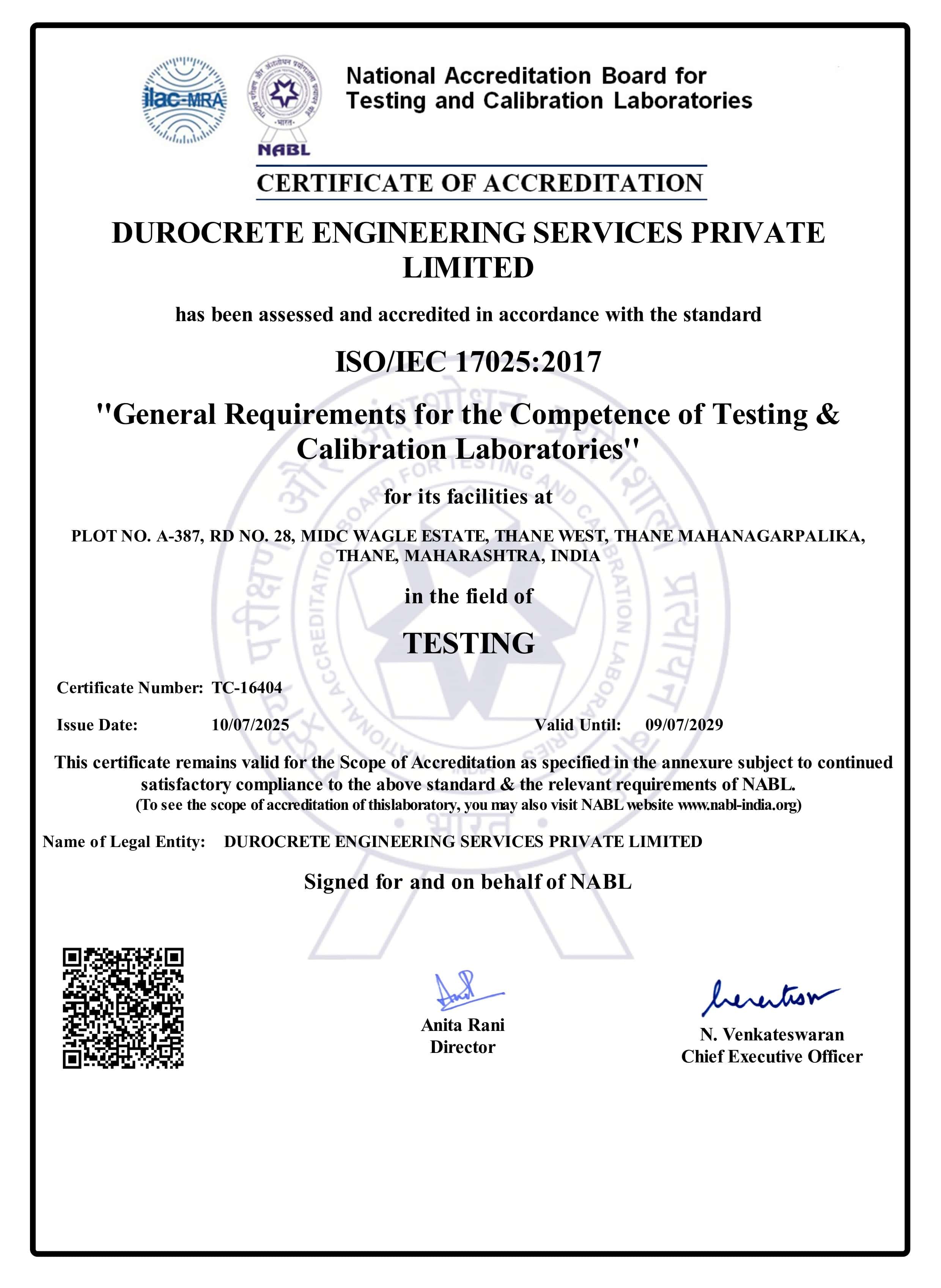 Durocrete With its Pune and Mumbai Laboratories being accredited under NABL – ISO 17025 having more than 230 tests under the NABL scope, Durocrete aspires to redefine standards of quality in testing and customer service.
